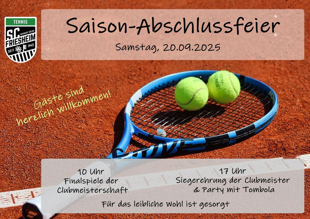 Am 14.09.2024 fand unsere jährliche Saisonabschlußfeier und die Endspiele unserer diesjährigen Cubmeisterschaften. Bei strahlendem Sonnenschein ging es ab 10h mit den Endspielen der Jugend los. Ab 11:30h fanden die Finalspiele der verschiedenen Herren,-und Damenaltersklassen statt. Bei leckerem Kuchen und gegrillten Würstchen konnten die zahlreichen Zuschauer spannende Spiele auf der Anlage sehen. Am späten Nachmittag fand die Siegehrung der diesjährigen Clubmeister (Haupt,-und Nebenrunde) statt. Die Sieger bei den Jugendlichen bekamen tolle T-Shirts und einen Pokal und die Erwachsenen Tennisbälle und eine Medaille. Im Anschluß fand die große Tombola statt, bei der es viele schöne Preise zu gewinnen gab. Danach folgte der gemütliche Ausklang unserer Saisonabschlußfeier mit leckeren kühlen Getränken beigemütlichem Beisammensein.